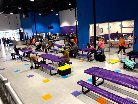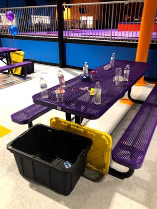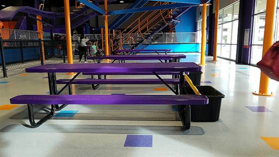 Plenty of tables for the parents to sit. COLD INSIDE unless you are jumping! Parents may want a light-coat along... Loads of fun for kids and parents can jump too!
